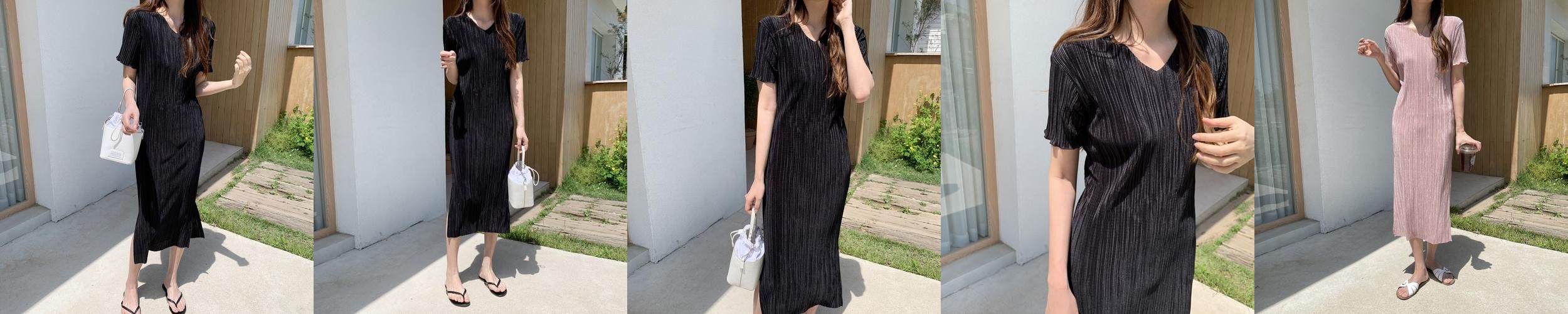 루즈핏 냉장고 반팔 플리츠원피스 주름 브이넥 맥시 여름 원피스 여성 롱원피스 블랙 데일리룩