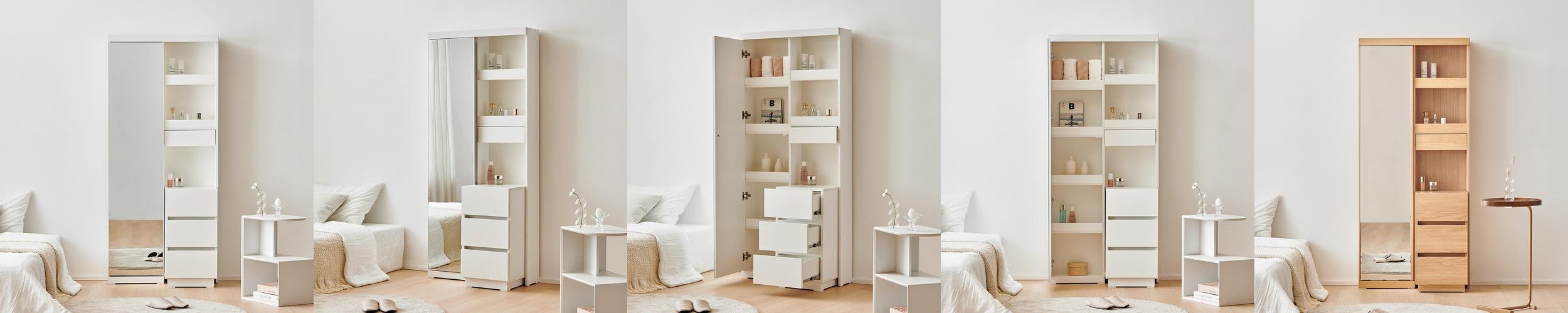 거울은 2/3 크기로 제작되어 사용 시 편리함을 더합니다. 서랍은 부드럽게 열리고 닫히며, 악세서리나 기타 소품을 수납하기에 적합합니다. 하부 공간은 가방 등을 보관하기에 유용합니다.