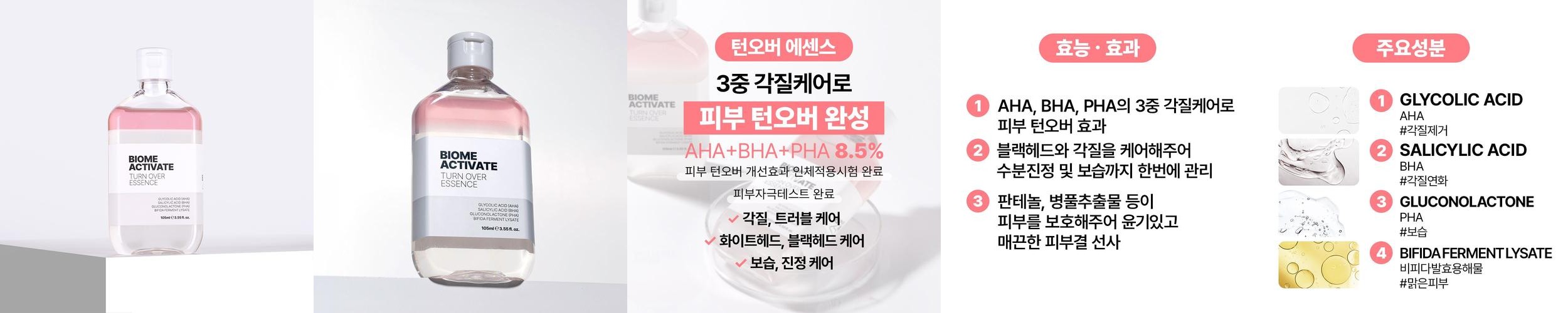 - 상품명: [바액] 턴오버 에센스 [105ml] 각질관리 블랙헤드 모공관리 피부결정돈 aha+bha+pha 8.5%함유