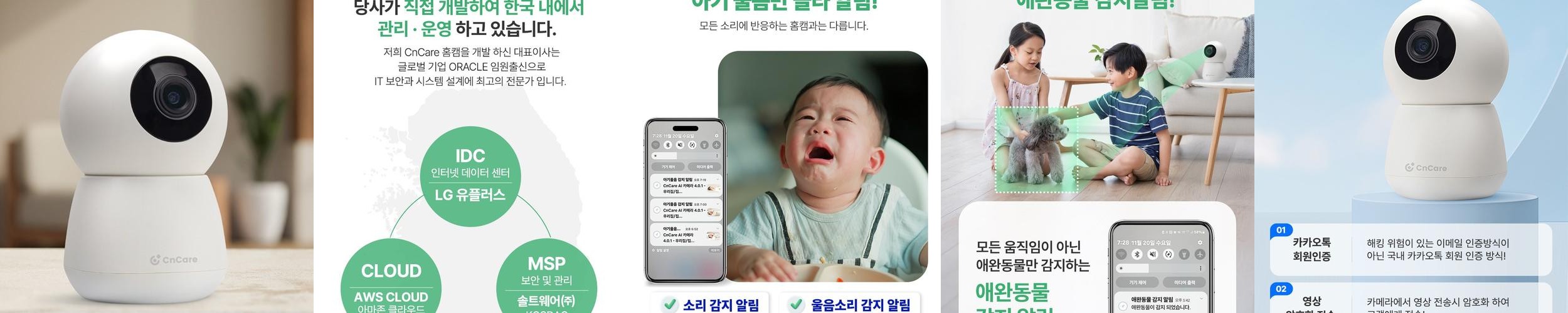 상품 소개: 씨앤케어 홈캠은 가정용 CCTV로, 400만 화소의 고화질 영상을 제공합니다. 이 제품은 아기와 반려동물의 안전을 지키기 위해 설계되었습니다. 특히, 한국에서 개발된 서버를 통해 해킹 위험을 최소화하였으며, 4중 보안 시스템을 갖추고 있습니다.