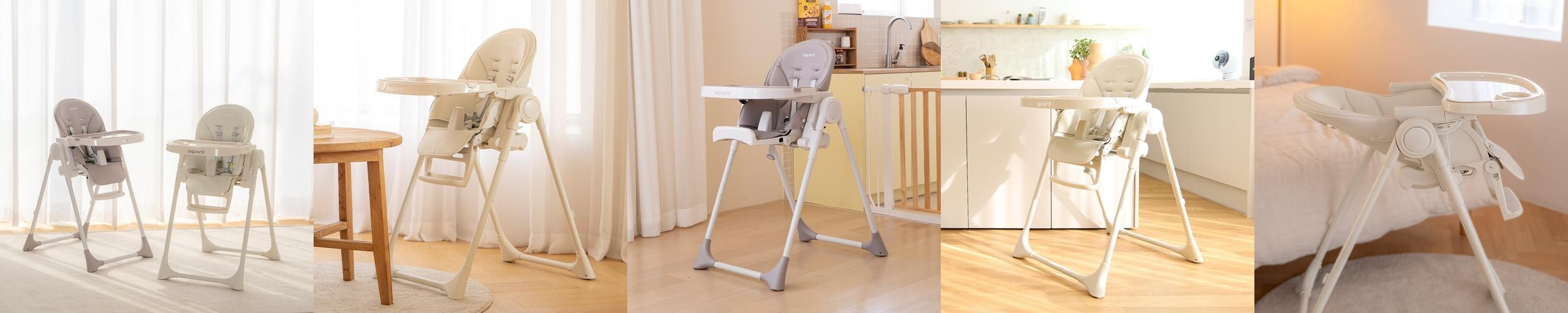 식사 시 아기와 함께할 수 있는 디자인으로, 부모가 식사하는 동안 아기가 옆에서 함께할 수 있는 공간을 제공합니다. 또한, 식판 트레이는 분리할 수 있어 청소가 용이하며, 사용하지 않을 때는 접어서 보관할 수 있는 점이 매우 실용적입니다. 바닥에 장착된 바퀴 덕분에 부드럽게 이동할 수 있어 집안에서의 활용도가 높습니다.