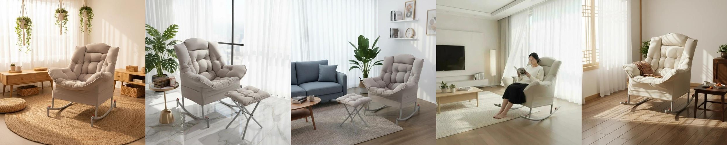 조립이 간편하여 누구나 쉽게 설치할 수 있으며, 복잡한 구성 없이도 실용적인 디자인을 자랑합니다. 흔들의자 기능은 안정감 있게 설계되어 있어 편안한 흔들림을 제공합니다. 스툴과 방석이 함께 구성되어 있어 다리와 허리를 편안하게 지지해줍니다.